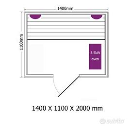 Dotata di vetro di sicurezza temprato di 6 mm e una stufa originale Harvia da 3,5 KW, richiede una tensione di 220 V e un contatore di almeno 4,5 KW per un funzionamento ottimale. Il tempo di pre-riscaldamento è di circa 50 minuti, con una temperatura operativa tra 80 e 90°C controllata da un termostato automatico.