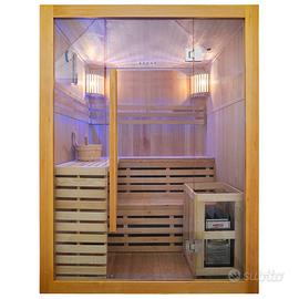 Questa sauna ha dimensioni generose di 150 cm di larghezza, profondità e 200 cm di altezza, e una porta ampia con vetro di sicurezza temperato di 8 mm, assicurando un ambiente spazioso e sicuro. Costruita con pareti di 4,2 cm con isolamento in robusta lana minerale e legno Hemlock Canadese certificato con finitura atossica, crea un'atmosfera naturale e raffinata.