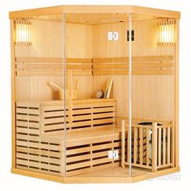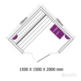 Con dimensioni di 150 cm di larghezza e profondità e 200 cm di altezza, offre comfort e spazio adeguati. La porta di 60 cm con vetro di sicurezza temprato da 8 mm facilita un ingresso sicuro. Costruita con pareti da 4,2 cm isolate in lana minerale, garantisce un'eccellente efficacia termica, mentre il legno Hemlock Canadese certificato, resistente e bello, è finito esternamente con un trattamento atossico per maggiore durata.