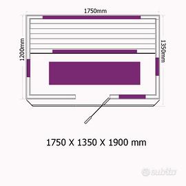La cabina misura 175 cm di larghezza, 135 cm di profondità e 190 cm di altezza, garantendo comfort e spazio abbondante. Una porta da 60 cm facilita l'accesso, mentre le pareti da 4,2 cm, isolate con lana minerale robusta, mantengono efficacemente il calore interno.