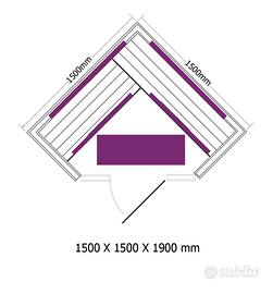 Dimensionata per l'uso domestico con 150 cm di lunghezza, larghezza e 190 cm di altezza, questa sauna offre ampio spazio per muoversi e rilassarsi. Una porta di 60 cm facilita l'accesso e migliora la comodità. Le pareti, da 4,2 cm e isolate con lana minerale, garantiscono un'ottima coibentazione termica, mentre la panca di 40 cm di profondità permette di sedersi comodamente.