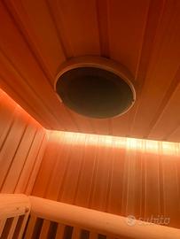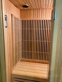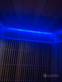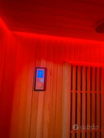 Peso kg 160 con display digitale, illuminazione con lampada interna, Cromoterapia a led, Radio FM, connessione bluetooth, riscaldamento con 6 pannelli radianti a base di fibra di carbonio infrarossi da 300W ciascuno e un pannello riscaldante inferiore in vetro da 150W con un consumo totale di Kw 1,95, alimentazione 220V.