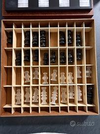 Scacchiera in onice, con pedine (16 nere e 16 bianche), custodia in legno originale.