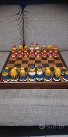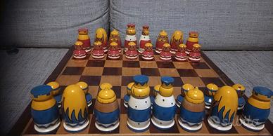 con pedine in legno raffiguranti uno stile "Matrioska", originale dei paesi dell'ex U.R.S.S.,in ottime condizioni con scacchiera piegevole a mo' di cofanetto, che funge da contenitore