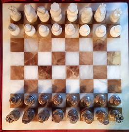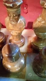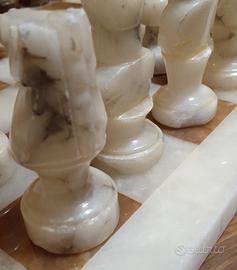 bella scacchiera e scacchi vintage in onice bianco e miele, ben conservata, con piccoli segni del tempo, usata solo come soprammobile.