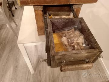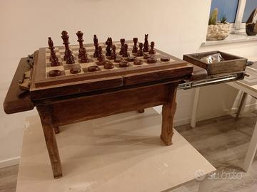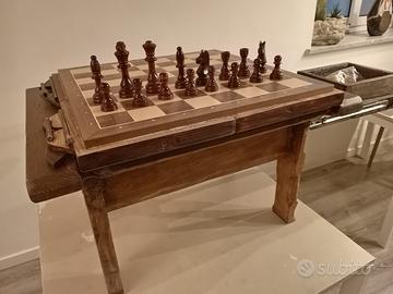 Scacchiera frofessionale con i quadrati di gioco 55x55mm con numeri e lettere, la schacchiera non è artigianale è comprata. Il tavolino ha affianco lo spazio per metterci l'orologio da gara (o da gioco). Scacchi in legno (comprati) dove il RE ha un'altezza di 10cm gli altri pezzi sono adeguati all'altezza del RE, pedine in legno (Comprate), per il gioco della dama da 35mm cad. Il mobiletto è in stile arte povera, rustico, con un cassetto estraebile dove dentro ci sono gli scacchi e le pedine per la dama, i cassetti sono foderati di un materiale spugnoso per salvaguardare i pezzi in legno.
