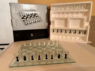 Scacchiera in vetro con i pezzi anch’essi in vetro a forma di bicchierini.