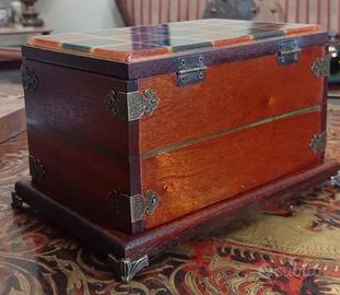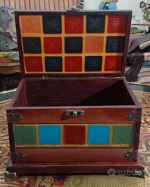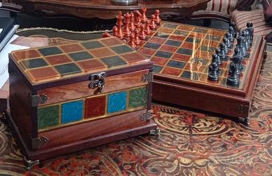 scacchiera in resina e legno. piano realizzato con singole tessere di resina con colori a contrasto. A corredo scacchi in resina in tinta e cofanetto contenitore in stile con identica colorazione.