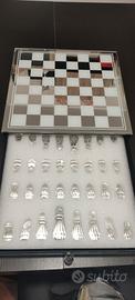 scacchiera in metallo e cristallo, dimensioni 35x35x6 cm.