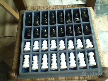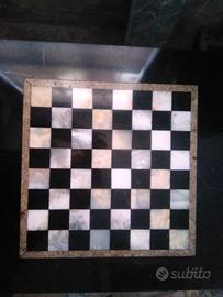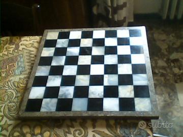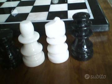 Tutti pezzi unici, originali, artigianali, fatti a mano negli anni '80, utilizzando marmi ed onici di pregio, prodotti per la vendita, mai usati, ancora nuovi, ottimi come articoli importanti ed originali da regalo o come complementi d'arredo: A) scacchiera cm 37 x 37 in marmo nero e rosa chiaro, bordo e fondo in marmo nero; B) scacchiera cm 41 x 41 in marmo nero ed onice (tipo alabastro), bordo e fondo in trachite; C) scacchi in marmo nero e bianco, i pezzi più piccoli hanno una base di mm 29 x mm 40 di altezza, mentre i più grandi misurano mm 30 x 64h, questi scacchi non sono pezzi unici ed originali in quanto prodotti in serie, ma comunque da artigianato italiano; D) tavolino da salotto, lavorato a mano, perfettamente adatto alle scacchiere in quanto utilizzato lo stesso marmo nero pregiato, il piano misura cm 60 x 60 x 2, la base a cubo nero cm 31 x 31 x 33h, la base in marmo chiaro cm 38 x 38 x 5h, altezza totale cm 40. Data la delicatezza del prodotto, si preferisce, se possibile, effettuare la consegna a mano. Ho anche qualche altro tavolino da salotto o giardino sia in marmo o in materiale plastico di design anni '60/'70, chiedere eventuali foto. Contattare per ulteriori informazioni o dettagli.