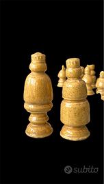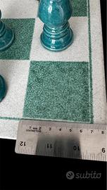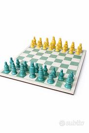 Scacchiera vintage con set completo di pezzi in ceramica smaltata bicolore (verde turchese e giallo ocra). La tavola è molto solida e pesante, con un peso complessivo di circa 10 kg, caratteristica che la rende stabile e ideale anche come elemento d’arredo oltre che da gioco. Dimensioni tavola circa 60 x 60 cm. Altezza re circa 12–13 cm Dimensioni casella: 7x7 cm Alcuni pedoni presentano difetti visibili, tra cui piccole sbeccature e segni del tempo (vedi foto dettagliate). Nel complesso buone condizioni vintage. Oggetto decorativo importante e scenografico, perfetto per collezionisti o per arredamento di carattere.