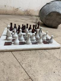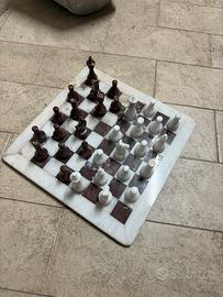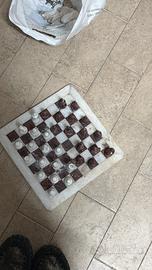 Unica pecca manca una pedina delle marroni per questo prezzo “basso” Materiale: Base in marmo massiccio con scacchi coordinati in pietra/marmo (toni del bianco crema e marrone venato). • Stile: Vintage / Artigianale. Ogni pezzo è unico grazie alle venature naturali della pietra.