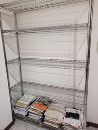 Vendo scaffalatura in metallo cromato con ripiani a griglia e rotelle, robusta e molto capiente.