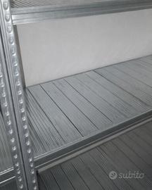Scaffalatura metallica ad incastro con ripiani zincati, ideale come scaffale per garage, cantina o magazzino.