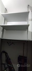 scaffalatura per cabina armadio o parete in alluminio e laminato, regolabile in altezza. E' composta da 2 elementi: nel primo ci sono 3 ripiani in laminato ed in basso una barra appendiabiti, altezza cm320 e larghezza cm 117; nel secondo ci sono 2 barre appendiabiti in alto ed in basso ed un ripiano in laminato, altezza cm 320 e larghezza cm 230. Come nuova. Si richiede smontaggio da parte dell acquirente.