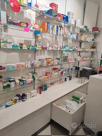 Scaffalatura e banco per negozio, precedentemente usato per parafarmacia, condizioni ottime sia degli scaffali che del banco. La scaffalatura copre 10 metri lineari, con cassetti in basso come in foto. Per qualsiasi info e prezzo scrivere in chat, prezzo e spedizione da concordare.