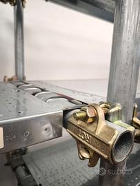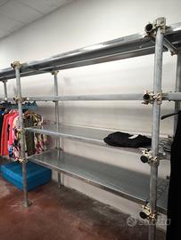 Sono ponteggii metallici modulari adattati come scaffali espositivi.