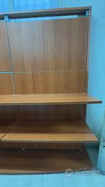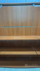 Due Scaffalature in legno, una da 315x205x53 e una da 315x269x53 complete di mensole in legno e reggi mensole in ferro.
