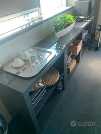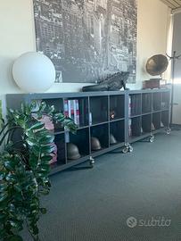 Quattro interessanti scaffalature laccate grigie, con ripiani ampi. Due sono provviste di ruote. I due scaffali con rotelle hanno dimensioni L149xP39xA90 ciascuno, mentre i due scaffali senza rotelle hanno dimensioni L78,5xP39xA79 ciascuno. Il prezzo è per 1 pezzo