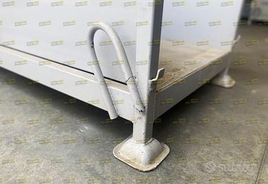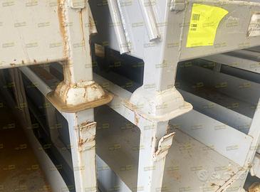 Contenitori rack o scaffalatura porta profili in acciaio verniciato colore grigio serie pesante. Sono sovrapponibili ad incastro con sistema a bicchiere rovesciato, hanno le finestre per la presa anti ribaltamento con carrello elevatore ed hanno i ganci per il sollevamento. Sono costruiti con tubolare d’acciaio sezione quadra mm50x50 e la base mm120x50. La base è rivestita in lamiera e le pareti lunghe solo parzialmente. Utilizzabili per lo stoccaggio ed il trasporto di profili, barre, tubolari, lamiere, pannelli ecc. ecc. Lotto di BUONA QUALITA’: possibili segni di ruggine superficiale e limitatissime piegature, il tutto come da documentazione fotografica. Misure esterne mm 3580 x 880 h840, Misure interne mm 3500 x 700 h620. Riferimento MP093-11, proposti da Polycube Srl, PREZZO SU RICHIESTA, possibilità di spedizione anche piccoli quantitativi, disponibilità SALVO IL VENDUTO.