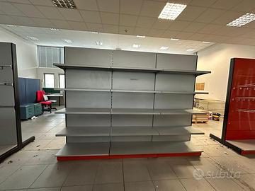 Scaffale in metallo grigio con prifli rossi composto da 3 unità indivisibili e con 5 ripiani.