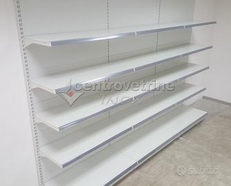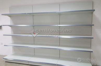 Kit composto da N° 3 scaffali in ferro "Linea IPERMARKET 35" con schienali lisci, N° 3 piani unico forati di base da 100 X 50 cm. con N. 12 piani unici forati da 100 X 50 cm regolabili in altezza, compreso carter inferiore e montante terminale. Scaffalatura metallica di serie colore Bianco Grigiastro ral 9002, Portata piano base: KG. 280 distribuiti uniformemente, portata piano sospeso: KG. 220 Portata per ogni piano distribuiti uniformemente. (escluso portaprezzi).