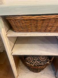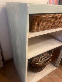 Scaffale con mensole in legno decorato con decapatura verde acqua trattato a cera puo esser utilizzato in cucina come dispensa o in camera da letto.