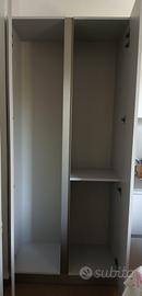 scaffale doppio da cucina, altezza cm 213, larghezza cm 97 e profondità cm 57. Le foto lo riprendono chiuso e aperto. I ripiani non sono stati posizionati tutti, ma ce ne sono 4 in ciascuna delle 2 colonne, quindi 8 in totale. Il colore è grigio perla.
