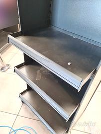 scaffale espositore per prodotti da cassa usato, si tratta di una scaffalatura molto robusta a 4 ripiani di marca Wanzl del 2021 con portata massima 80kg e portata ripiano 20kg. adatta per l'esposizione di prodotti da cassa come: chewin-gum, caramelle, cioccolatini, barrette, etc. dimensioni: 64X48cm h168cm, vani 60X40cm