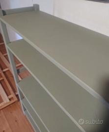 Come da foto e titolo vendo mobile scaffale libreria di Ikea modello Ivar così composto: - 2 montanti misura 30 x 124. - 5 ripiani misura 30 x 83. Il legno è strato trattato per renderlo più durevole e più bello esteticamente, in particolare modo ho carteggiato tutto e applicato 2 mani di pittura all'acqua a base gessosa extra opaca in colorazione verde oliva. (Siccome in foto il colore non rende come dal vivo è possibile dare un'occhiata alla mazzetta colori ed a svariate foto di mobili realizzati con la stessa pittura che ho applicato io, la marca è Novecentopaint e sul loro sito si trova tutto). Ovviamente si presenta in condizioni estetiche ottime. Prezzo leggermente trattabile ma alle NO offerte assurde! Disponibile per il ritiro in zona Milano ovest e dintorni, eventualmente mi potrei spostare se la distanza non è eccessiva.