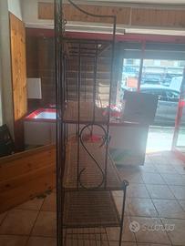 scaffale in ferro battuto e vimini a 5 ripiani. alto un metro e novanta per ottanta, i 3 ripiani più grandi sono profondi 40cm i 2 superiori sono profondi 28cm