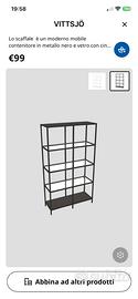 Scaffale moderno in metallo nero con ripiani in vetro, già montato, con ripiani in vetro trasparente. All'Ikea si vende smontato a 99 € ( v. foto pagina web) Come nuovo, solo ritiro a Milano.