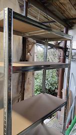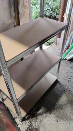 Scaffale in metallo con ripiano in legno.