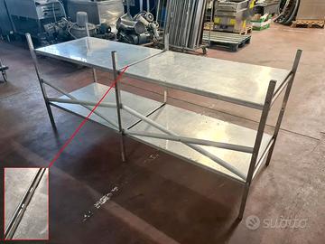 scaffale inox basso usato, si tratta di una scaffalatura doppia in acciaio inossidabile semiartigianale a due ripiani rinforzati adatta per: celle frigorifere, magazzini alimentari, cucine, ospedali, etc.