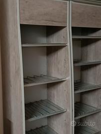 Scaffale in legno e ripiani in metallo con rastrelliera, composto da due elementi gemelli. Largh cm 50 x 2; H cm 200; Prof cm 40