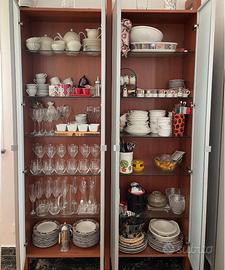 - un sistema componibile . La colonna portante a muro in nobilitato si completa con: ripiani in vetro temperato, elementi contenitori di ante in vetro. In foto viene proposta la composizione costituita da ripiani in vetro e impiallacciato ciliegio posti a diverse altezze, Più due contenitori.