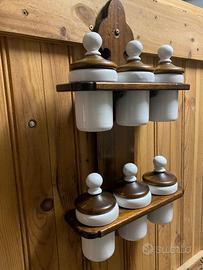 Set di barattoli in ceramica con coperchi con supporto in legno Vintage. set barattoli cucina stile vintage, porta barattoli legno rustico cucina, contenitori spezie con supporto legno, barattoli vintage decorazione cucina, organizer spezie legno naturale, Set barattoli cucina, Barattoli con supporto in legno, Porta barattoli da cucina, Contenitori ermetici, Vasetti porta spezie, Set dispensa cucina