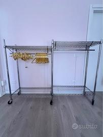 Vendo 2 scaffali modulari in metallo racking con ruote, ideali per negozi, showroom o magazzini.