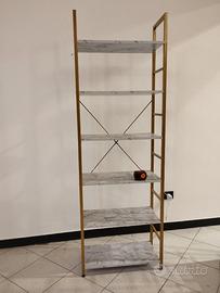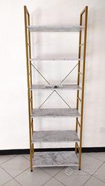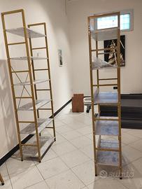 Numero 7 scaffali dorati in metallo e legno ingegnerizzato, (più 1 angolare in regalo), varie misure e altezze, e numero 6 tavolini in metallo dorato e vetro temperato, lunghezza 100 cm e 130 cm.