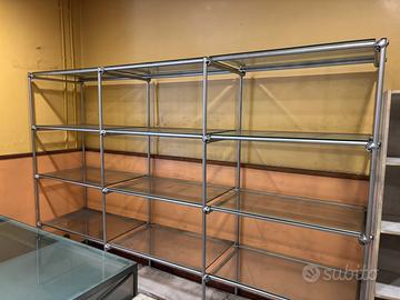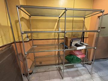 Vendesi numero 3 scaffali (due in vetro) e tavolo di vetro in blocco o separatamente. Condizioni ottime solo da pulire