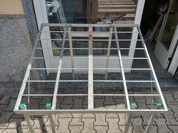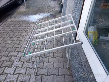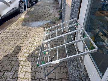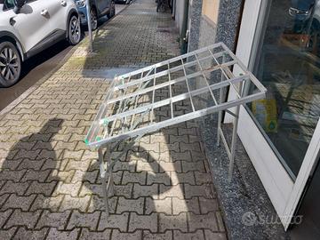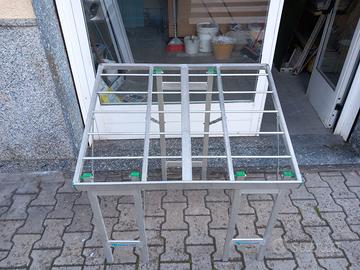 N° 1 Scaffale in Alluminio con larghezza 90 cm. Profondo 70 cm. Altezza varia da 65 a 85 cm.