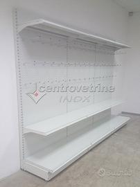 Kit composto da N° 3 scaffali in ferro "Linea IPERMARKET 35" con schienali lisci e N° 6 schienali forati, N° 3 piani unico forati di base da 125 X 40 cm. con N. 6 piani unici forati da 125 X 40 cm regolabili in altezza, compreso carter inferiore e montante terminale. Scaffalatura metallica di serie colore Bianco Grigiastro ral 9002, Portata piano base: KG. 250 distribuiti uniformemente, portata piano sospeso: KG. 170 Portata per ogni piano distribuiti uniformemente. (escluso portaprezzi).