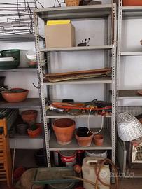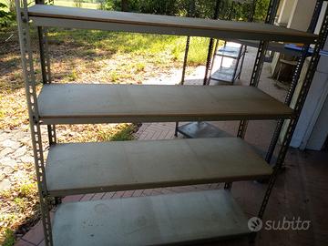 Vendo 9 scaffali in metallo, molto robusti, varie altezze ( da 180 a 250 cm ), con ripiani 40 x 100 oppure 120 cm .Alcuni ripiani sono perfetti, con copertura in truciolato, altri con lievi segni di ruggine ( problema solamente estetico che non ne compromette la solidità).Prezzi variabili a seconda del numero di ripiani e condizioni degli stessi