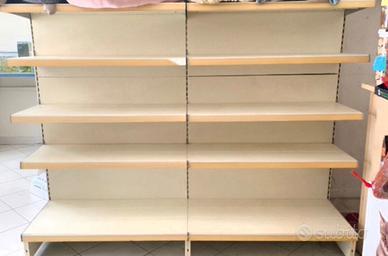 Disponiamo di 15 metri lineari totali altezza 2 metri, profondità ripiani 40 cm base 60 cm, abbiamo anche alcuni metri di ripiani da 60 cm.Include anche 2 gondole centrali con ripiani e un'altra gondola da 2 metri lunghezza per 1.60 altezza con pannello forato (che volendo possono diventare scaffali a muro)."