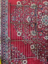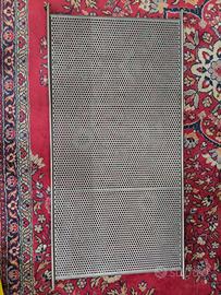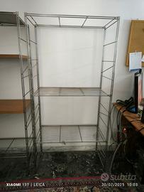 Vendo 2 scaffali in filo zincato con ripiani in legno color ciliegio e ripiani in acciaio zincato. H delle sponde laterali mt 1,60, profondità 39 cm, larghezza massima 77 cm.