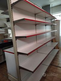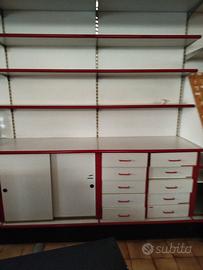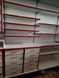 Moduli, scaffali con struttura in ferro e ripiani in laminato da 90 cm H2,30 mt. Sono disponibili mobili con cassetti e ripiani, o alveari e ripiani o solo ripiani. I mobili provengono dalla libreria che ha cessato l'attività. Ogni modulo costa 50 euro.