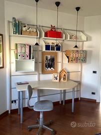 Per cambio arredamento, figli grandi , cedo come da foto scaffali , sedia , scrivania. Arredamento ditta Di Liddo e Perego montata nell'anno 2000. La scaffalatura verde ha anche 3° ripiano .