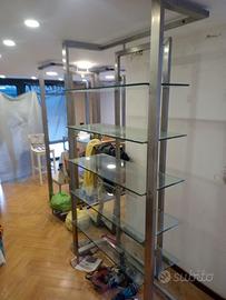N5 scaffali per negozio arredamento ecc, 1 tavolo acciao vetro super resistente. Usabili sia come scaffali che entrambi con appendiabiti. Sto cercando il costo dei vetri.