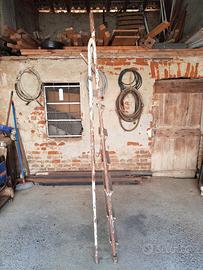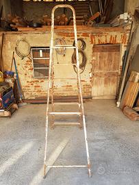 scala in ferro, molto robusta e non troppo pesante, 6 grandi in legno e piano, altezza utile massima 155 centimetri, altezza utile fino all'ultimo gradino 131,5 centimetri larghezza base 59, larghezza ultimo gradino 33, gradini da 8 x 1,5 centimetri. piano 24 lato largo, 20 lato stretto x 1 centimetro di spessore. scala data, ma ancora solida, sempre tenuta al chiuso. ritiro a mano
