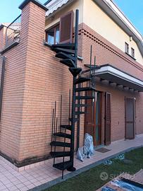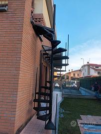 scala a chiocciola da esterno a base tonda, larghezza 120 cm, struttura in acciaio galvanizzato nero, gradini in acciaio galvanizzato nero, con corrimano (non visibile nelle foto perchè non montato), 16 gradini, altezza finita cm 350 max, adattabile ad una misura inferiore. Mai utilizzata per misurazione errata. Già smontata e riposta in confezione originale, pronta all'uso, completa di minuteria